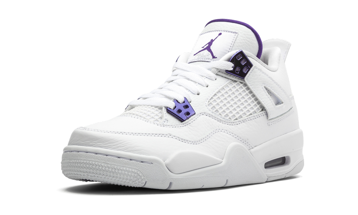 The Air Jordan 4 GS "Metallic Pack - Purple" is the grade school sizing of the summer 2020 release. Part of the “Metallic Pack” featuring four regionally released metallic-accented colorways of the Jordan 4 also including red, orange, and green, this “Purple” edition was available in the US. The construction features a white full-grain leather upper with a metallic purple finish on the TPU lace eyelets and heel Jumpman logo. Matching purple is also found on the inner lining, tongue logo, and visible Air unit. The Metallic Purple Air Jordan 4 GS released on May 20, 2020. Metallic Pack - Purple