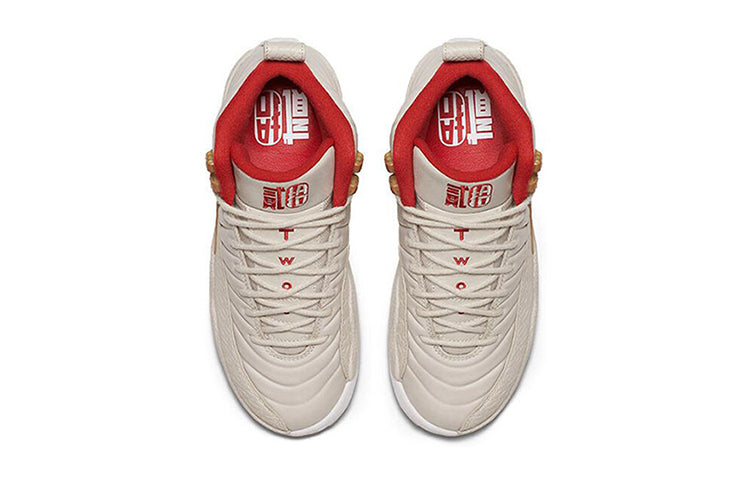 This Air Jordan 12 Retro 2017 CNY celebrates the lunar holiday with a monochromatic tan finish across the upper. It features a light orewood premium textured leather upper, a basket woven textured trim, woodgrain accents, a varsity red trim, and Chinese characters.